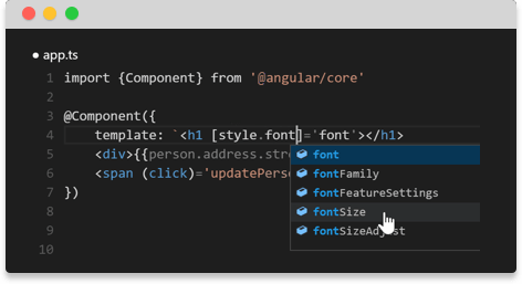 Build features quickly with simple, declarative templates. Extend the template language with your own components and use a wide array of existing components. Get immediate Angular-specific help and feedback with nearly every IDE and editor. All this comes together so you can focus on building amazing apps rather than trying to make the code work.